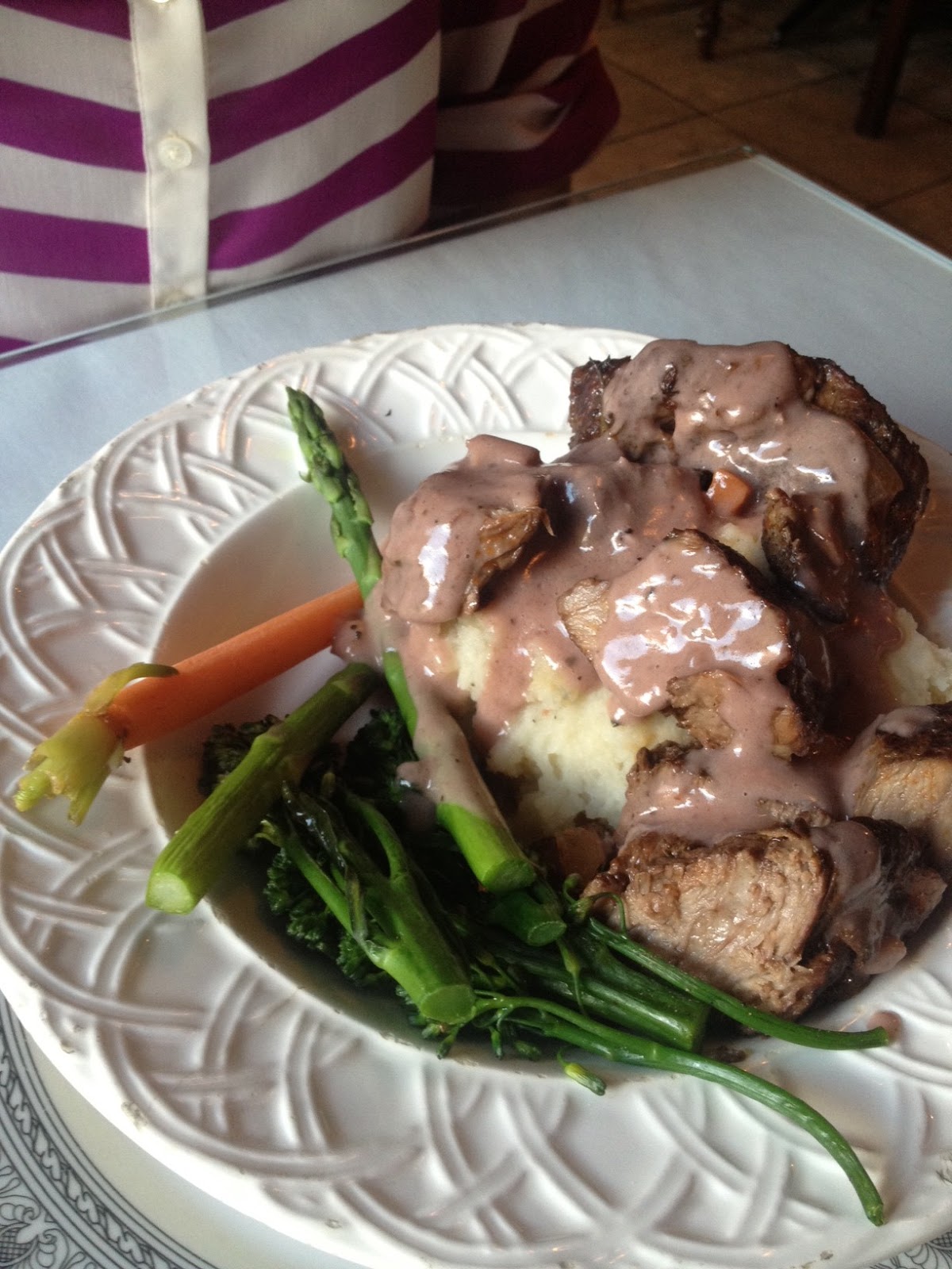 Amelia ordered the wagyu short ribs. Despite the fact that Wagyu beef is a big, big lie just like Kobe beef, her dish was fantastic. While the wild boar had been dominated by (a delicious) medley of flavors from the slow cooker, the short ribs are sauced with a burgundy gravy that lets the flavor of the beef come out, and the beef was plenty flavorful in this case to stand mostly on its own. The short ribs are served with blue cheese rosemary mashed potatoes and baby vegetables.